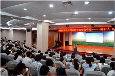 主席高度评价了陈教授的讲座以及大家参与的热情,他说,陈教授是台湾茶业届的权威,前段时间天仁茗茶深受农残问题的困扰,陈教授发声力挺,并用实验证明饮茶的安全性。主席说他从17岁开始卖茶,每天都在喝茶,茶届泰斗张天福先生105岁了还在喝茶,茶是安全健康的饮料,有茶当喝直须喝,莫待无茶空望杯。以此鼓励在座的师生,要多喝茶,以茶为伴,共享健康生活。