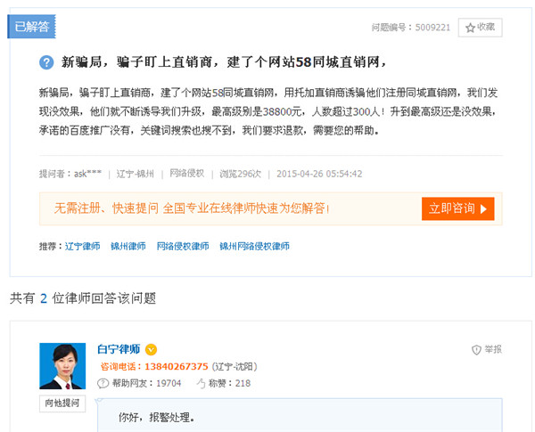 近日,许多用户举报58同城直销网利用“托”(假冒某某公司的经销商)来诱骗经销商注册58同城直销网会员及购买他们的会员产品。当经销商在58同城直销网的推广没有效果时,“托”就会再次诱导经销商买更高级别的会员—无极天尊会员。然而当经销商交了38800元款项上升到最高级别,推广却依然没有效果,此时当初诱骗经销商购买58同城直销网的“托”却消失不见,经销商维权无门。