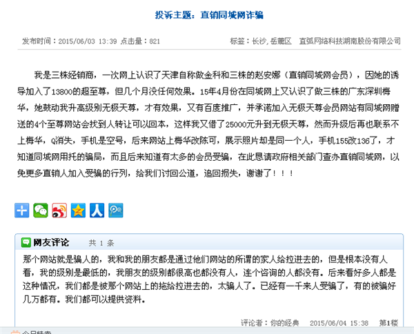 通过在百度搜索“直销同城网欺诈”、“直销同城网骗局”等字样,可以看到许多用户的举报材料,对此可以看出已有不少人已上当受骗。