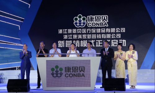 罗总讲话结束后和当地政府领导、康恩贝集团领导共同推动启动杆,正式启动浙江康恩贝医疗保健品有限公司的新营销业务。
