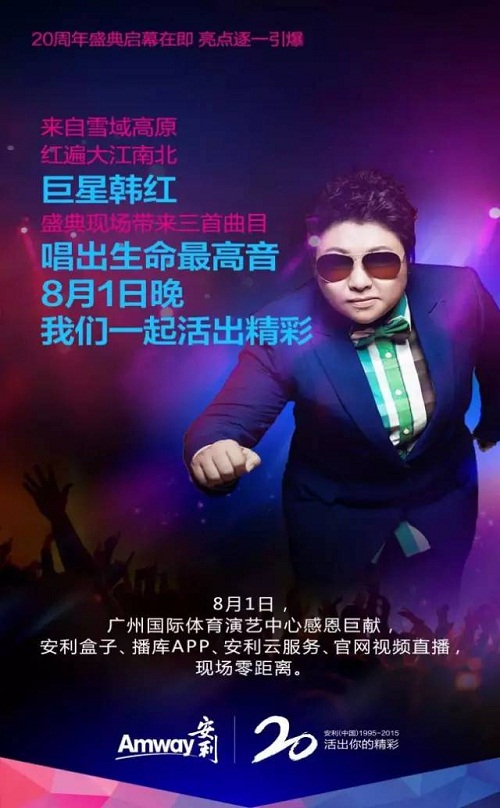 巨星韩红、中国达人秀冠军尹中华将亲临现场,与安利伙伴们共度激情时刻。今年3月刚拿下湖南卫视《我是歌手第三季》冠军的韩红,将以浑然天成、辨识度极高的 “韩式天籁”献声庆典。同为公益事业的先行者,韩红对于安利这些年来投入巨资用于春苗营养厨房等公益项目表达了肯定与支持。此次与安利结缘于庆典,韩红会 倾情演绎自己的三首经典歌曲。除了巨星带来的音乐洗礼,由2014 年《中国达人秀》冠军得主尹中华献艺的高难度杂技作品《逐梦》将把庆典推至视觉盛宴的高潮。《逐梦》曾是尹中华一举拿下中国达人秀冠军的节目,整个表演古 典与现代融汇、唯美与曼妙相遇、力量与技巧兼具。此次为安利庆典专属定制,在原有基础上特意加入了契合安利精神的新元素和新动作,在如梦似幻的3D背景的 烘托下,本已惊心动魄的演出届时又会有哪些亮点瞬间征服全场?请大家拭目以待。
