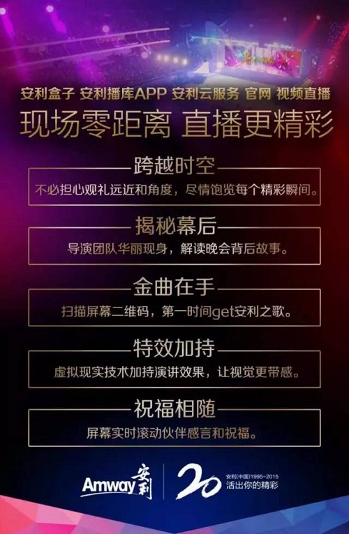 如此一场大体量投入,高规格上演的盛世庆典,在直播上更是精益求精。盛典邀请了全国首屈一指的曾多次把控国际电影节任务的电视直播执行团队,首次引入了网路 “全程大直播”的概念。直播室将直接架设在现场,并通过虚拟演播系统,生动地呈现现场活动,使得观看者的视觉体验更加生动和有趣。经由安利盒子、安利播库 APP、安利云服务、官网视频直播这种全方位立体交互直播的方式,共同见证20周年盛典的每一个精彩瞬间。