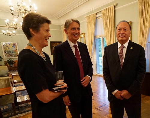 英国外交大臣菲利普·哈蒙德(中)、英国驻华大使吴百纳(左)与李金元董事长亲切交谈
