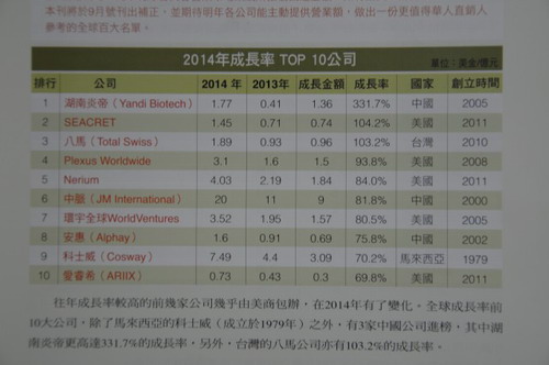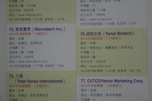 据亚太区最具影响力的传智集团旗下《直销世纪》8月刊最新公布的《2014世界一百大跨国直销公司排行榜》专题获悉,2014年度业绩排名炎帝生物跃居全球百强行列,以2014年1.77亿美元的净销售额荣登榜单76位。并以331.7%的成长率荣膺2014年全球直销企业成长率NO.1!