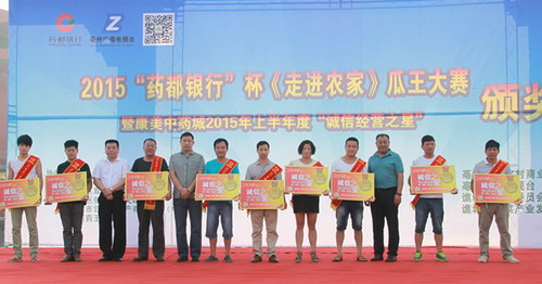 8月14日,康美(亳州)华佗国际中药城举办了2015“药都银行”杯《走进农家》瓜王大赛暨康美中药城2015年上半年“诚信经营之星”颁奖盛典,活动由亳州市汇润房地产有限公司(中央公园)协办。