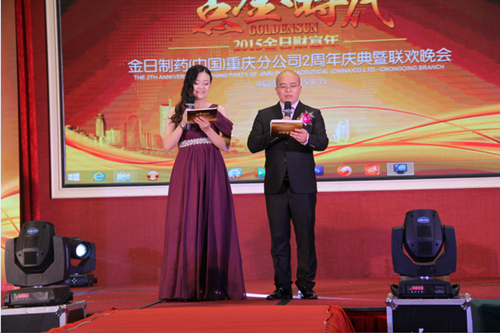 2015年8月15日,点金时代·金日制药(中国)重庆分公司2周年庆典暨联欢晚会在重庆市哈曼酒店隆重召开。金日集团常务副总裁、金日制药(中国)有限公司总经理张阳辉、金日制药(中国)有限公司西南区副总监兼重庆分公司总经理吴仕相、金日制药(中国)有限公司教育部讲师刘元卉、金日制药(中国)有限公司市场发展委员会委员袁熙尧、黄建军、周德军、杨洪军、各市场领导人及来自四川、湖北、贵州、重庆等地方共近1000人齐聚美丽山城重庆,共襄盛会。