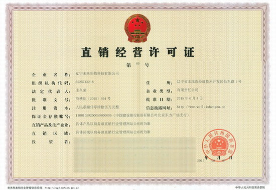 2015年6月4日,辽宁未来生物科技有限公司获得直销经营许可证,这也正式宣告了辽宁未来生物成为第69家获得直销牌照的企业。
