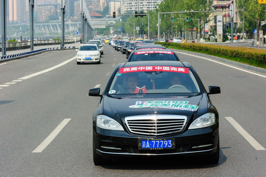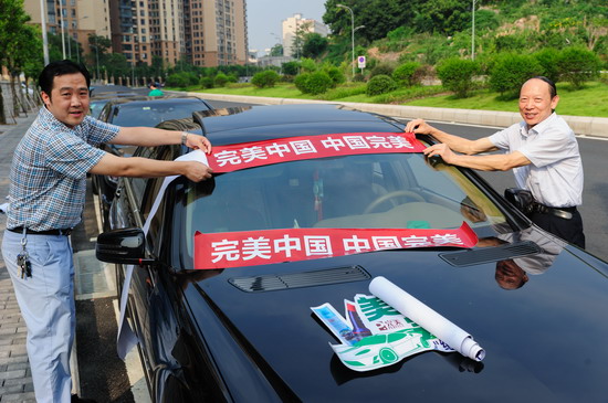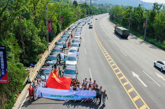 上午11点,发车仪式正式开始,完美客户纷纷把自己的爱车装扮一新,绕着美丽的滨江路进入到时长4个小时的自驾行程中去——嘉陵江碧波荡漾、过江大桥横跨南北、房屋错落有致,从东方升起的太阳早早迎接着完美车队,一路上市民纷纷投来惊奇和羡慕的目光。一路车程过得飞快,万州的完美客户早早等在高速路口迎接我们的到来,他们的车辆早已装扮一新纷纷加入到完美抗战自驾嘉年华车队中来,汇入的车流形成了两排美丽的弧线,完美客户们拿着中国共产党党旗和完美小旗子向着摄像机的方向留下了一张张美丽的画卷。