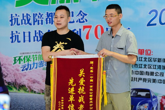 8月24日上午9点,从四面八方的完美客户驾驶着自己的爱车参加启动仪式,资深客户总监徐时祥先生、江湾城社区杨勇春书记和完美重庆分公司业务部袁宁经理纷纷上台致辞和发言。业务部袁宁经理代表完美重庆分公司通过社区转赠价值2000余元的完美产品给到抗战老兵进行慰问,完美重庆分公司也被授予“关爱抗战老兵先进单位”。