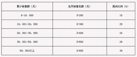 (2)直销员的累计销售额满足上表中某档累计销售额,但直销员的当月直接销售额不满足表中同档的当月销售定额时,则直销员当月直接销售额所实际满足的当月销售定额相对应的提成比例作为计算直销员报酬的提成比例。