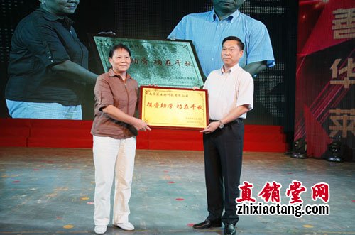 市教育基金会安化县办事处主任邓晓君(左)回赠了“捐资助学,功在千秋”的牌匾