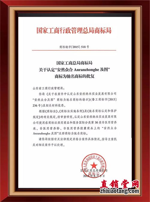近日,安然公司“安然众合”商标被国家工商总局认定为中国驰名商标。这是国家对安然产品的认定和对安然品牌的高度认可。
