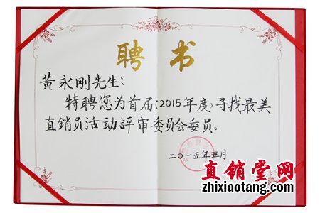 新时代健康产业(集团)有限公司总经理黄永刚先生,应主办单位邀请,出任了首届(2015年度)寻找最美直销员活动评审委员会委员,并为本次活动题词:“直销员是大众创业、万众创新中的一道靓丽的风景线”,“祝首届‘寻找最美直销员活动’取得圆满成功”。“中消报直销动态” 微信公众号对黄总做了评委介绍。