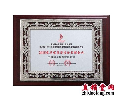 第八届(2015)最受尊敬的直销企业年度评选颁奖典礼也是2015年战略平台上行业英雄风云际会的舞台,鉴于历年来为中国直销业的发展所作出的卓越贡献和2014-2015年度的企业发展实际,为树立典范,表彰先进,经网上调查投票、各地企业经销商推荐和组委会专家评审委员会审核,三株福尔在此次盛会中被评为“2015最具发展潜力的直销企业”。