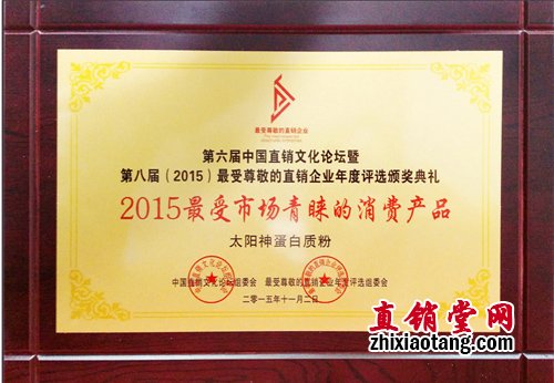 惊喜与收获接连不断,11月初,由中国直销研究院、当代直销全媒体中心、中国直销文化论坛组委会主办的“第六届中国直销文化论坛暨第八届(2015)最受尊敬的直销企业年度评选颁奖典礼”在北京隆重召开。中宣部舆情局、国家机关事务管理局、公安部办公厅、国家工商总局、中央电视台新闻中心、新华通讯社、人民网等30多家主流媒体单位领导出席了此次会议。会上,太阳神凭借这一年的突出表现,荣获“2015最受尊敬的直销企业”,太阳神“蛋白质粉”荣获“2015最受青睐的直销产品”殊荣。