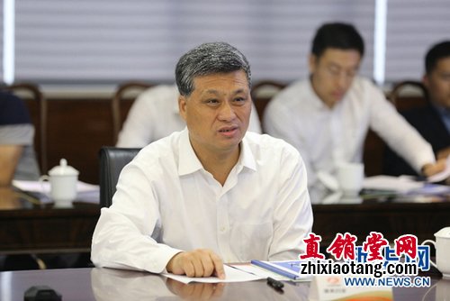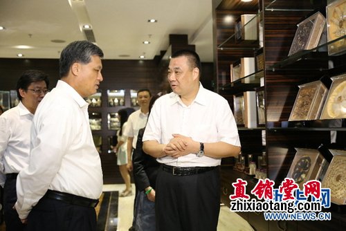 康美药业董事长、总经理马兴田董事长(右)介绍康美药业发展情况。