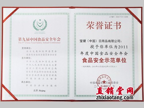 宝健因在食品安全、质量、科技创新等方面,为国家做出了卓越贡献:在持续不断地为国人提供安全、营养、健康食品的同时,积极提供健康咨询服务,全面提升国人的食品安全意识和营养水平。在此次年会中,宝健特被授予“食品安全示范单位”。