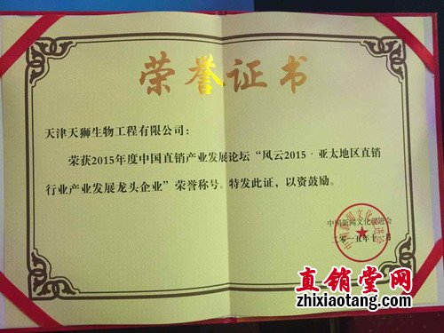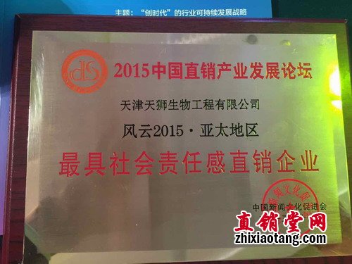 2015年11月21日,由中国文化促进会和海畴企业集团联手打造的“2015中国直销产业发展论坛暨直销立法十周年庆典”在北京九华山庄隆重举行,天狮集团作为直销行业龙头企业亮相本次庆典,并荣获“最具社会责任感直销企业”和“亚太地区直销行业发展龙头企业”两项大奖。