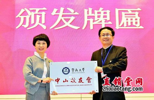 暨南大学对外联络处处长梁燕(左)向中山校友会授予牌匾(右黄小纲)