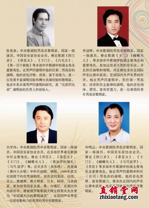 中央歌剧院“北京四兄弟”男声四重唱艺术家小组,成立于1984年,四位国家一级歌剧表演艺术家以一种既高雅又通俗、既细腻又热情奔放的演唱风格,在各种类型的演出中为广大群众热情讴歌。他们走访了美国、日本、澳大利亚、新加坡、马来西亚、香港等国家及地区,受到当地评论家、同行及观众们的赞誉和好评。在1998年至2001年他们连续应邀在新加坡、马来西亚、香港举办专场音乐会,受到了当地社会各界热烈欢迎。2000年他们被评为由国家广电总局颁发的(全国听众最喜爱的歌手)最佳组合金奖。他们录制的CD专集《半个月亮爬上来》深受国内外听众的好评。