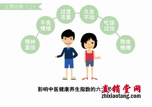 “全民中医健康养生报告”中提出“中医健康养生指数”,主要包含健康状态与养生状况两大方面共计79项指标。报告显示,我国城镇居民中医健康养生指数为58.7分,其中健康状态69.1分,养生状况46.0分。由此可见,我国城镇居民的健康状态与养生状况有较大的改善空间,其中养生状况需重点关注。从健康状态来看,较突出的问题是血虚、阳虚、气虚与胃肠积热。