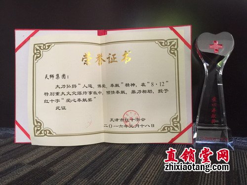 2016年1月18日,天津红十字会理事会召开,为2015年度为美丽天津建设展现新作为做出新贡献的爱心企业进行表彰。天狮集团因在“8-12”特别重大火灾爆炸事故中,大力弘扬“人道、博爱、奉献”精神,倾情奉献,鼎力相助,被天津红十字会授予“爱心奉献”奖。