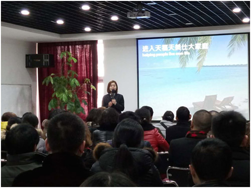 会议在下午两点准时开始,由分公司员工汪倩主持、分公司王然经理主讲天美仕的未来发展前景规划。