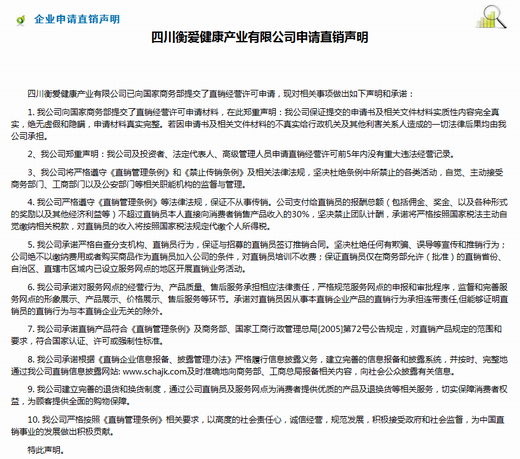 2016年2月14日,春节假期结束后的第一个工作日,商务部直销行业管理信息系统网站上就挂出了四川衡爱健康产业有限公司申请直销声明,这表示四川衡爱健康产业有限公司已向国家商务部提交了直销经营许可申请。