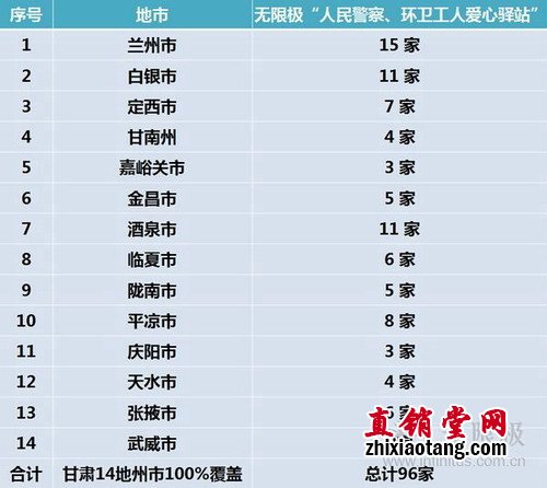 无限极“人民警察、环卫工人爱心驿站”甘肃省分布情况: