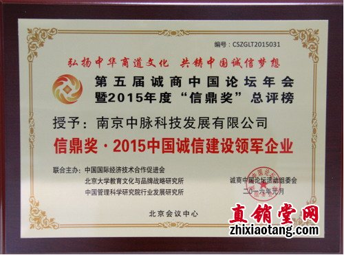 在刚刚结束的第五届“时代先锋·诚商中国”论坛上,中脉科技凭借多年来良好的企业信用和在消费者中优良的口碑,赢得了论坛组委会的肯定,被授予“信鼎奖·2015中国诚信建设领军企业”荣誉称号。