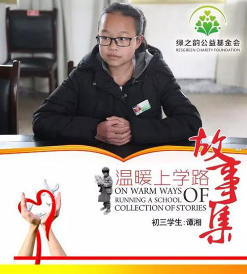 浏阳市小河乡小河初中初三学生。皮肤黝黑,身材瘦小的谭湘,谈吐大方,倒不怕生。谭湘的父亲左眼失明,母亲多病,为了供谭湘和弟弟继续上学,父母亲拖着病务农的同时还外出打零工。谭湘从来没有像同龄孩子那样吵着出去玩,总是在学习之余做家务。小的时候,她学着扫地、收拾屋子,上学后渐渐学会了洗衣、做饭。在家里,谭湘是个懂事的好孩子;在学校,她是师生公认的好学生,是班级的学习委员。她深知家境的艰难,更知道家里供他上学的不易,因而学习非常刻苦,也从没有因自己家庭贫困而自卑,因此也得到了学校老师、小伙伴们的喜爱。每天五点多天还没亮,她就要起床准备上学,十几公里,一个多小时的车程,她说不辛苦,因为月亮会照亮她的骑车上学路。问她长大以后想做什么?她说想当医生或者老师,因为可以帮助很多的人,但是其实最想做的是画家,她相信自己会梦想成真。