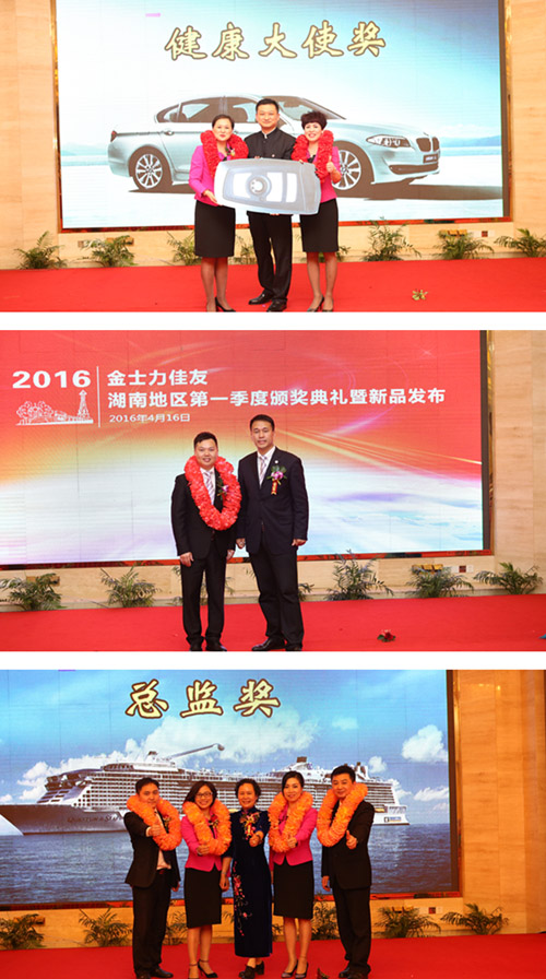 除此之外,大会对奋战在湖南一线市场的优秀事业伙伴们进行了隆重的表彰,期间晋级表彰代表肖荣、贺玉军分享了自己以及家人所获得的健康和精神层面上的改善以及提升。最后,湖南区域绩优经销商王辉与王彦霓姐妹,在现场热烈的掌声与喝彩中,表达了对于公司领导以及市场伙伴的真挚感谢,同时号召新老朋友,在2016年努力实现无限大的自身社会价值,并且承诺愿意带领伙伴们实现共赢的终极目标,极具感染力的讲话把现场的气氛再次带到了制高点。