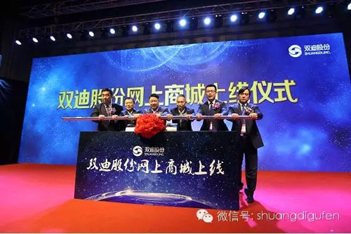 双迪股份副董事长兼执行总裁郑凤强与各系统领导人苏永、刘谏、管庆磊、任宏伟、张玉清共同启动双迪股份网上商城。