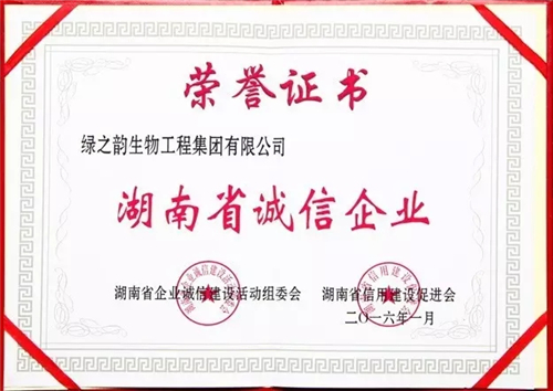 为树立诚信标杆,弘扬诚信精神,推动我省诚信体系建设,营造良好信用环境,在中共湖南省委宣传部、湖南省工商行政管理局的支持和指导下,经过湖南省企业诚信建设活动组委会和专家组历时6个多月的严格评审及声誉监测,本着科学、务实、规范和公正、公平、公开的原则,绿之韵集团被湖南省企业诚信建设活动组委会、湖南省信用建设促进会联合评定为“湖南省诚信企业”和“湖南省质量服务百强品牌”。