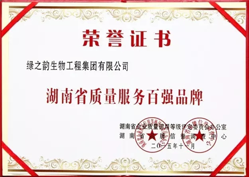 绿之韵获湖南省诚信企业及质量服务百强品牌