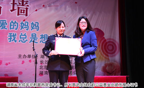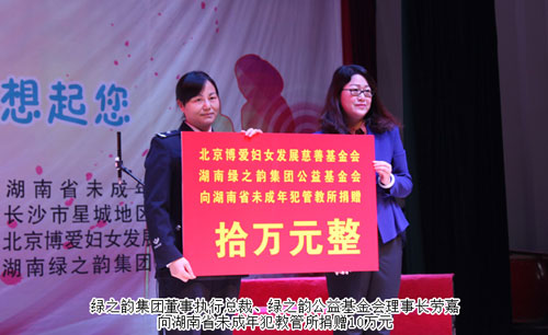 活动现场,湖南省司法厅党组成员、副厅长、省监狱管理局党委书记、局长方华堂讲话,他感谢来自社会各界的无私大爱,不但能解决服刑人员及其家里的实际困难,温暖、感动日夜盼望他们回家的亲人的心,更能使服刑人员懂得了爱,更学会了感恩,让他们充满信心和希望,迎接未来的生活。绿之韵集团董事执行总裁、绿之韵公益基金会理事长劳嘉向湖南省未成年犯教管所捐赠10万元,并表示,每个青少年都是实现中国梦的强大青春能量,每个人都可以跌倒再爬起,只要孩子们努力学习改造,掌握技能本领,就一定能重回正途、重塑人生,迎来崭新、美好的明天。