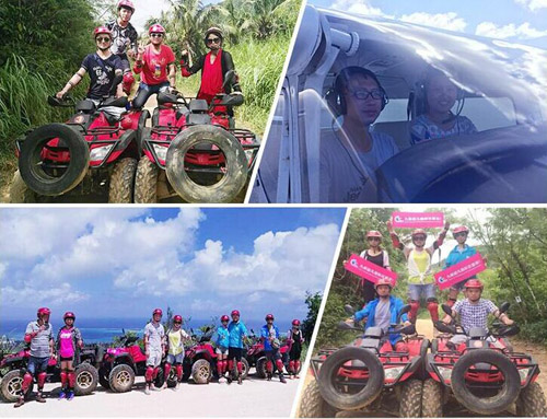 除了天上飞的,当然还有地上跑的,越野车探险同样也是不可错过的刺激项目。驾驭ATV越野车驰骋在岛上各种复杂地形, 绝对是惊险刺激的驾驶体验。家人们全副武装坐在越野车上是不是很拉风呢。
