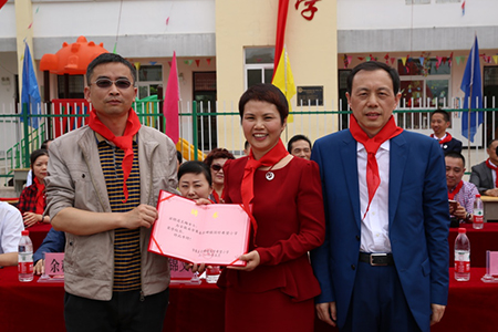 金寨县教育局工会曹福东主席向捐资人王梅女士颁发了荣誉校长证书并揭牌。接过证书的王梅女士感慨万千,她说,作为家乡人,又出生在学校的她对校园有着不一样的感情,选择金寨是因为这里是“红军的摇篮、将军的故乡”,曾诞生过59位开国大将,是著名的革命老区。王梅表示,今后她将每年举办红色之旅,缅怀革命先烈,践行四特精神,延续对国珍希望小学的捐助工作,带领更多的伙伴成为国珍希望小学的捐资助学的楷模。