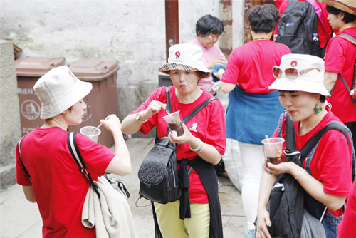 伙伴们品尝周庄特色小吃,不亦乐乎。