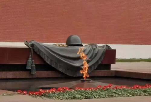首先,让我们来到无名烈士墓。莫斯科的无名烈士墓,位于红场西北侧克里姆林宫红墙外的亚历山大花园里,为纪念反法西斯战争牺牲的无名英雄而建造的,修建于1967年胜利节前。正面朝北、东西走向的深红色大理石陵墓上,稍靠西侧陈设着钢盔和军旗的青铜雕塑,造型简洁明快,蕴意肃穆深长。墓前有一个凸型五星状的火炬,五星中央喷出的火焰,从建成时一直燃烧到现在,从未熄灭,它象征着烈士的精神永远光照人间。两座玻璃岗亭置放于墓的两侧,亭前站着两名神情庄重的持枪哨兵,昼夜为烈士守灵。