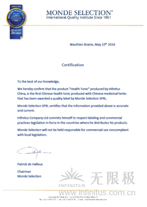 国际品质评鉴组织主席Patrick de Halleux表示:“无限极(中国)有限公司生产的‘增健口服液’,为首款获得国际品质评鉴组织质量标签的中草药制成的中国健康口服液产品。全球资深专家和评委们对其中草药配料和复合多糖的效果与功能描述进行了审查,认可这款中草药口服液符合并满足了国际食品高标准要求及产品质量符合欧洲质量标准。”