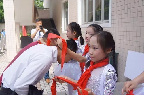 开场前,小朋友们为北京罗麦科技有限公司华东区市场副总监江军和北京罗麦科技有限公司浙江分公司外事经理夏海涛系上红领巾。