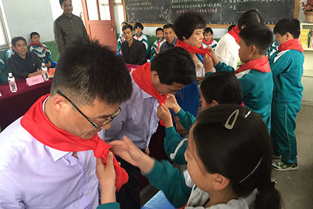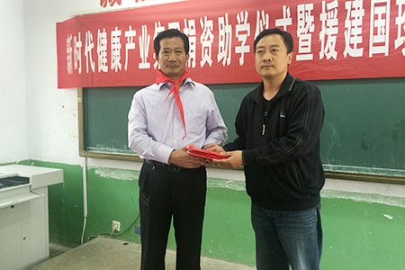 迎着蒙蒙的细雨,董副总与同行人员一起步入校园,希望小学的学生们为领导嘉宾戴上鲜艳的红领巾,表达敬意和感激之情。捐赠仪式中,董副总首先代表公司向希望小学捐赠了爱心捐款,山东分公司经理仇海成与国珍健康生活馆馆长代表也分别代表山东分公司和新时代人向贫困学生捐赠了爱心捐款,国珍健康生活馆馆长代表许英祥还向学校赠送了国珍产品,校方向董副总赠送了锦旗。