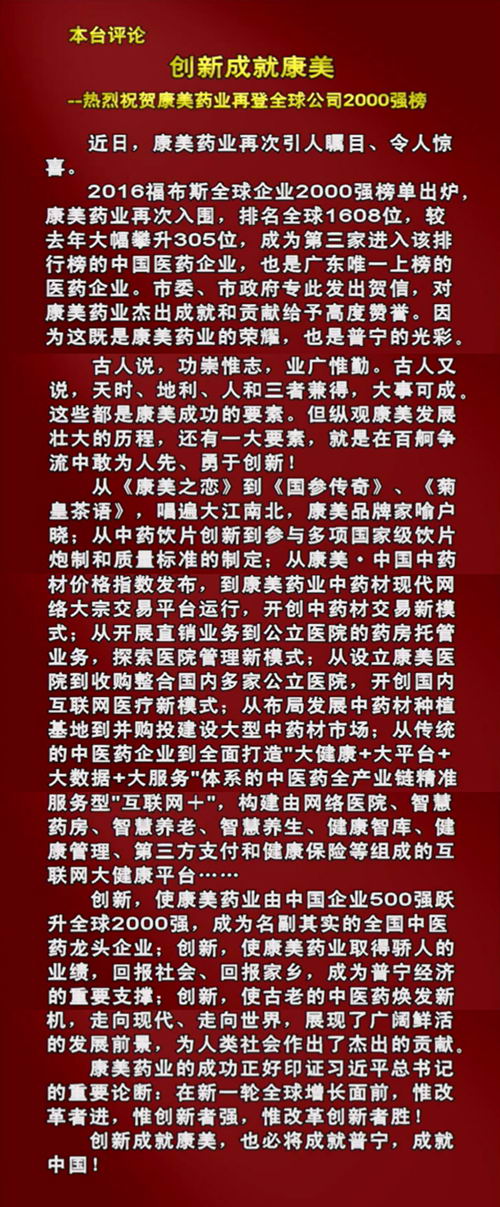 2016福布斯全球企业2000强榜单出炉,康美药业再次入围,排名全球1608位,较去年大幅攀升305位,成为第三家进入该排行榜的中国医药企业,也是广东唯一上榜的医药企业。市委、市政府专此发出贺信,对康美药业杰出成就和贡献给予高度赞誉。因为这既是康美药业的荣耀,也是普宁的光彩。
