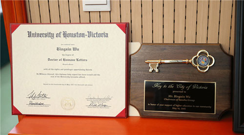 美国当地时间5月14日,在休斯顿大学—维多利亚的毕业典礼上,中国三株集团董事长吴炳新先生,被授予人文博士学位。