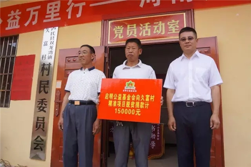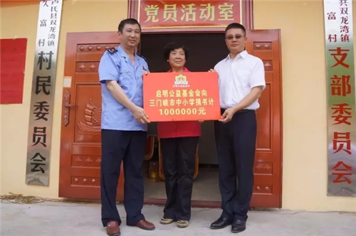为贯彻落实精准扶贫精神,支持困难群众脱贫致富,启明公益基金会立足镇村实际长远谋划、多方整合,物质和精神资助双管齐下——向久富村捐赠扶贫资金15万元,发展农村支柱产业,带动群众增收致富;向双龙湾镇中心小学捐赠10万元图书,同时面向全市中小学捐赠100万元图书,改善中小学校的阅读条件,实现更有价值、更有意义的教育扶贫。