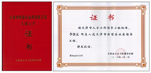 在第四批“新型企业家培养工程”培养对象的申报工作中,李金元董事长凭借创新精神及其突出贡献,经过初审和推荐、形式审查、专家评审、社会公示,最终经天津市人才工作领导小组审核批准,入选天津市新型企业家培养工程。