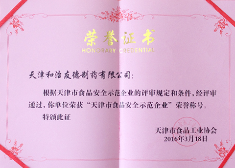 2016年6月22日,和治友德再度收获喜讯:天津市和治友德制药有限公司成功入选“2016年天津市食品安全示范企业”。据悉,食品安全示范企业评选严格、准入门槛高,此次和治友德能够荣获此项殊荣,是政府对于企业高品质产品的高度认可。