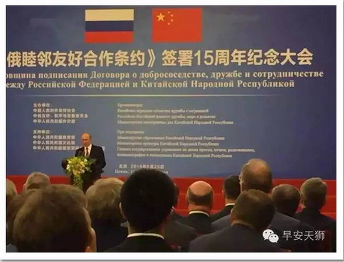 习近平主席在纪念大会上发表重要讲话。他说15年来,在《中俄睦邻友好合作条约》精神指引下,中俄全面战略协作伙伴关系在高水平上快速向前发展,各领域合作取得丰硕成果。双方建立起高度政治互信。双方都把对方发展视为本国发展的机遇,致力于共同发展,实现共同繁荣。双方建立起完备的高层交往机制,确保双边关系高水平运行。双方基于共赢原则开展互利互惠经济合作。双方人文交流蓬勃发展,传统友谊日益巩固。