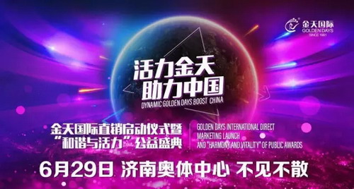 活力金天,助力中国。“金天国际直销启动仪式暨“和谐与活力”公益盛典”6月29日,济南奥体中心,不见不散!